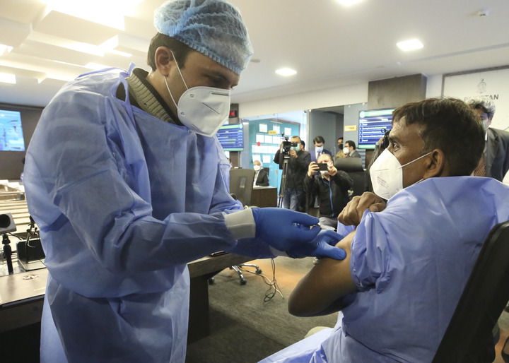 2月3日,在巴基斯坦伊斯兰堡的巴应对新冠疫情国家指挥和行动中心,一名一线医务人员(右)接种中国捐赠的新冠疫苗。新华社记者刘天摄
