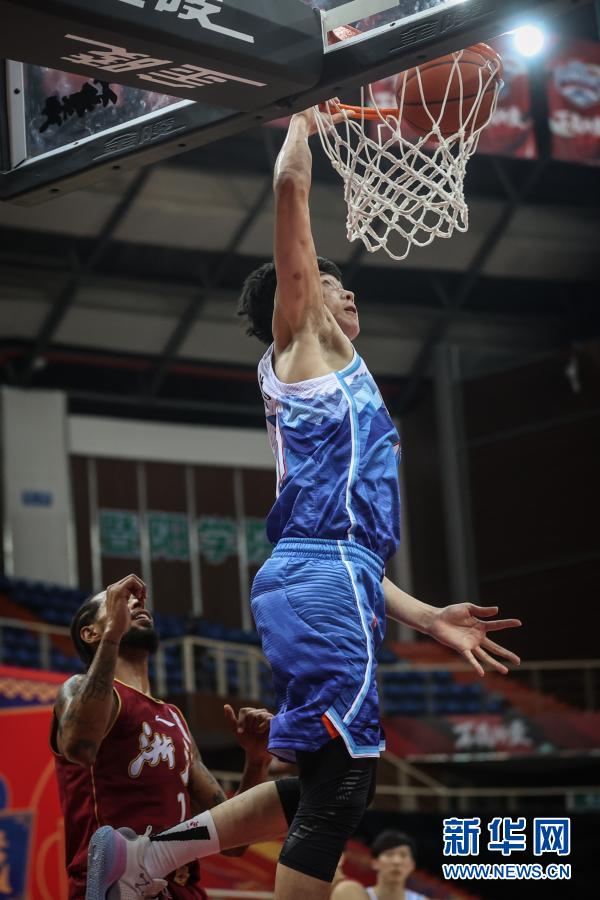 2月6日,新疆伊力特队球员齐麟(右)在比赛中扣篮。 当日,在浙江诸暨进行的2020-2021赛季中国男子篮球职业联赛(CBA)第二阶段第39轮比赛中,新疆伊力特队以99比93战胜浙江稠州金租队。 新华社记者 潘昱龙 摄