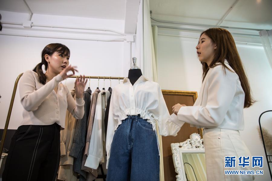 2月3日,朋帕维(左)和甘妮塔在位于泰国曼谷的网络服装店办公室内给模特假人搭配衣服。新华社记者 张可任 摄