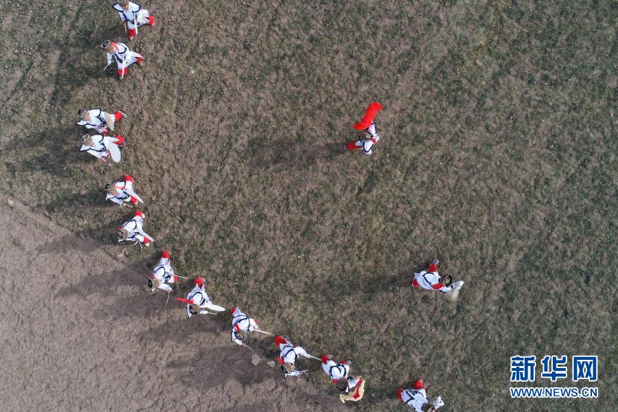 2月7日,渭源县麻家集镇路西村村民在表演羌蕃鼓舞(无人机照片)。