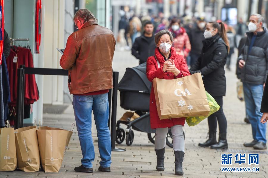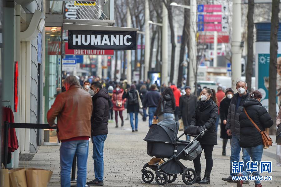 2月8日,市民们在奥地利维也纳的玛利亚希尔夫大街购物。 当日起,奥地利政府谨慎解除第三次疫情封锁,购物商场、学校等恢复开放。维也纳部分解封后,许多商场也在严格各项防疫措施的同时推出优惠活动吸引顾客。 新华社记者 郭晨 摄