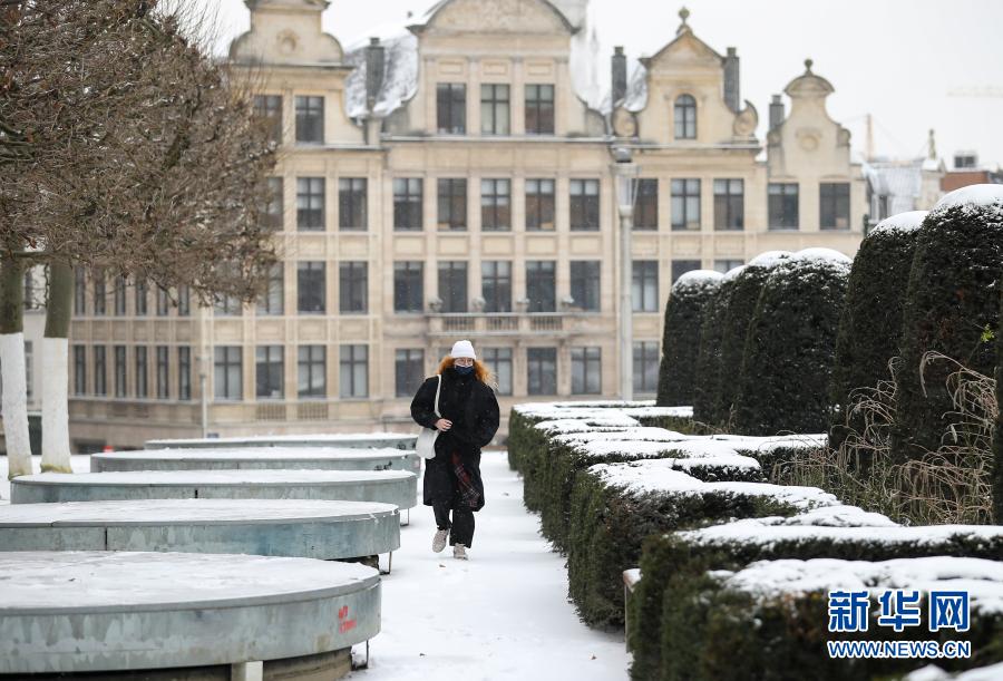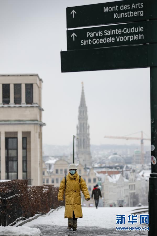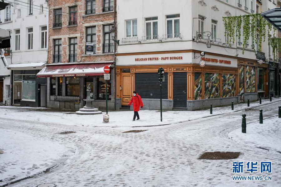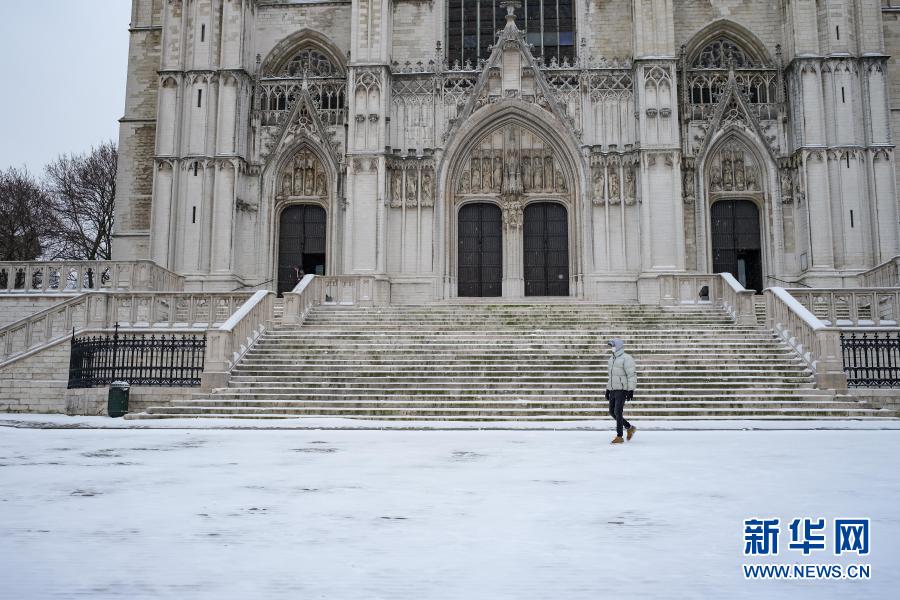 2月8日,一名行人在比利时布鲁塞尔出行。 近日,比利时布鲁塞尔迎来降雪天气。 新华社记者张铖摄