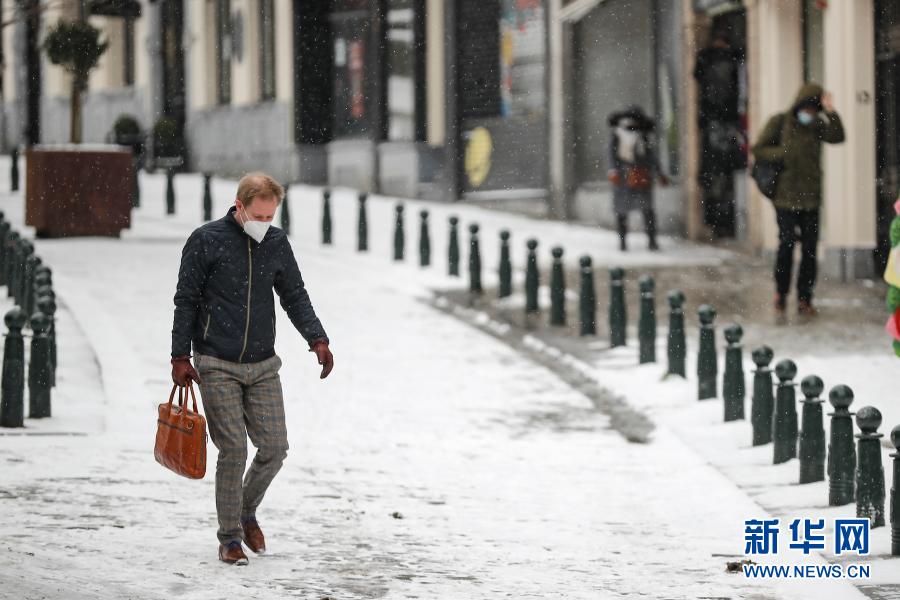 2月8日,行人在比利时布鲁塞尔出行。 近日,比利时布鲁塞尔迎来降雪天气。 新华社记者张铖摄
