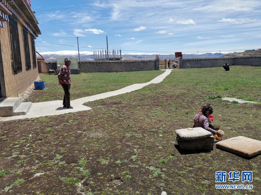 四川省甘孜藏族自治州理塘县奔戈乡卡灰村村民洛登(左一)在家门口(2020年5月30日摄)。新华社记者 康锦谦 摄