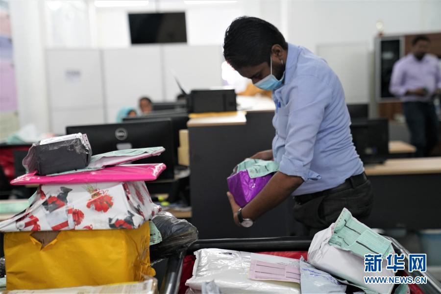 2月8日,斯里兰卡科伦坡一家当地跨境转运公司的雇员整理春节前从中国收到的一批货物。新华社记者 唐璐 摄