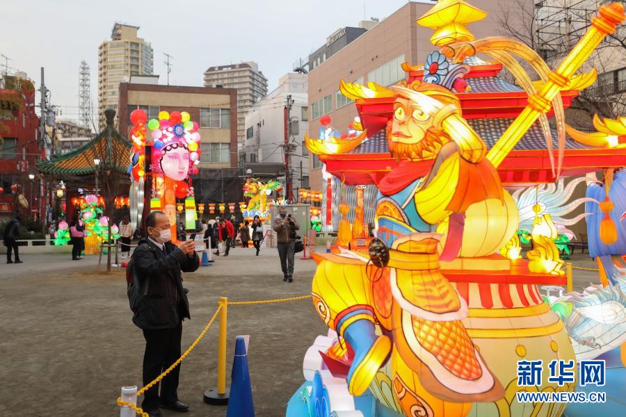 为庆祝中国农历新年,日本横滨中华街的公园12日展出以中国文化为主题的花灯,为当地带来新春的喜庆气息。此次花灯展示活动将从12日持续至26日。