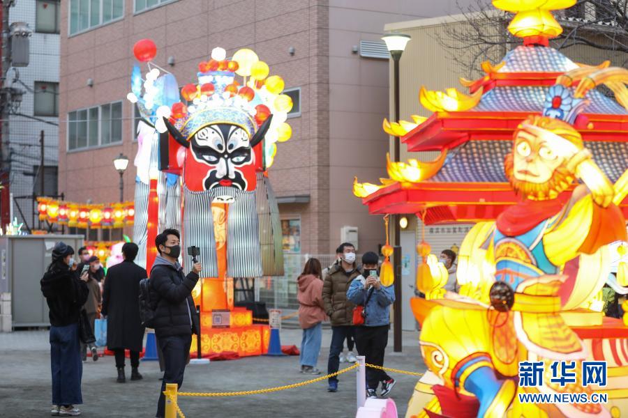 2月12日,游客在日本横滨中华街的公园内欣赏花灯。 为庆祝中国农历新年,日本横滨中华街的公园12日展出以中国文化为主题的花灯,为当地带来新春的喜庆气息。此次花灯展示活动将从12日持续至26日。 新华社记者 杜潇逸 摄
