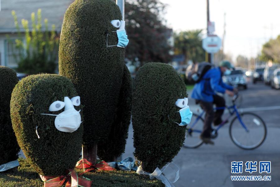 2月17日,在美国加利福尼亚州北部小城圣马特奥,街道边的几株景观植物被装饰成戴着口罩的拟人形象,以提醒人们在外活动时佩戴口罩,减少新冠病毒的传播风险。新华社记者 吴晓凌 摄 |