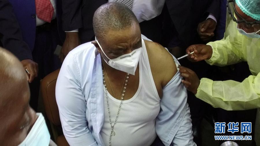 2月18日,在津巴布韦首都哈拉雷的威尔金斯医院,津巴布韦副总统兼卫生部长奇温加接种中国国药集团生产的新冠疫苗。