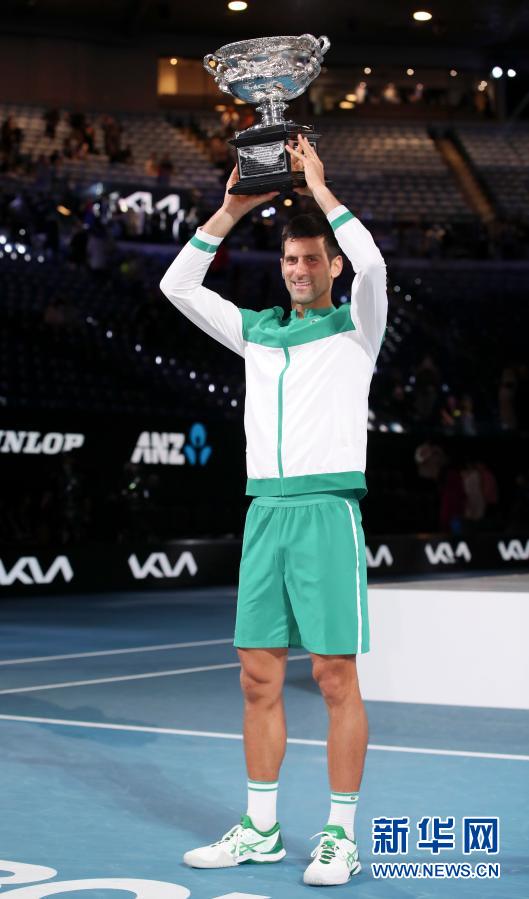 2月21日,焦科维奇在颁奖仪式上捧杯。 当日,在澳大利亚墨尔本进行的2021年澳大利亚网球公开赛男单决赛中,塞尔维亚选手焦科维奇以3比0战胜俄罗斯选手梅德韦杰夫,夺得冠军。 新华社记者 白雪飞 摄