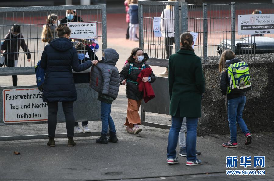2月22日,部分学生和家长在德国法兰克福一所小学的校门口逗留。自当日起,随着新冠防疫措施的逐步宽松,德国部分联邦州的学校和日托中心复课。新华社记者 逯阳 摄