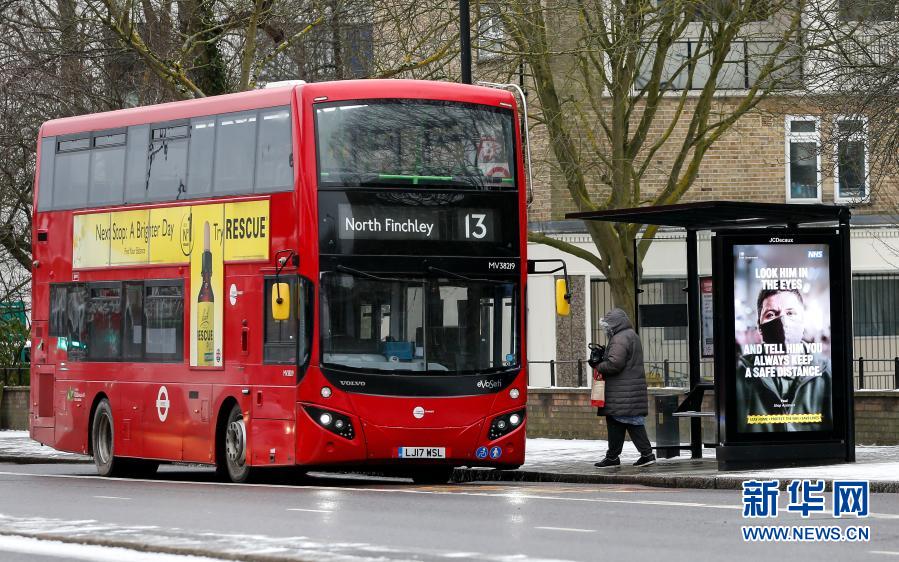 2月8日,一名乘客在英国伦敦准备乘坐一辆公交车,车站的广告牌提示人们保持社交距离。 英国政府8日发布的数据显示,英国当日新增新冠确诊病例14104例,累计确诊病例3959784例。 新华社记者 韩岩摄
