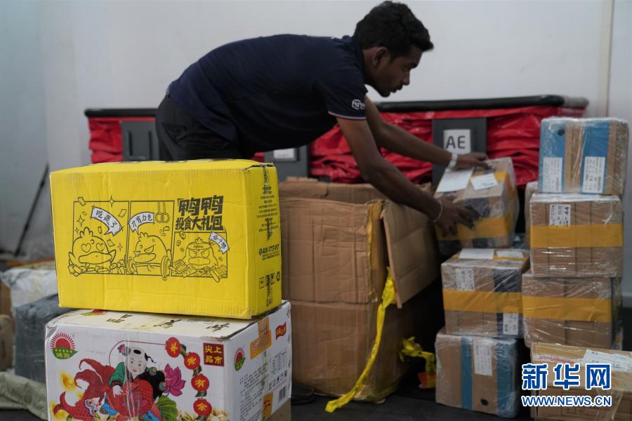 2月8日,斯里兰卡科伦坡一家当地跨境转运公司的雇员整理春节前从中国收到的一批货物。新华社记者 唐璐 摄 |