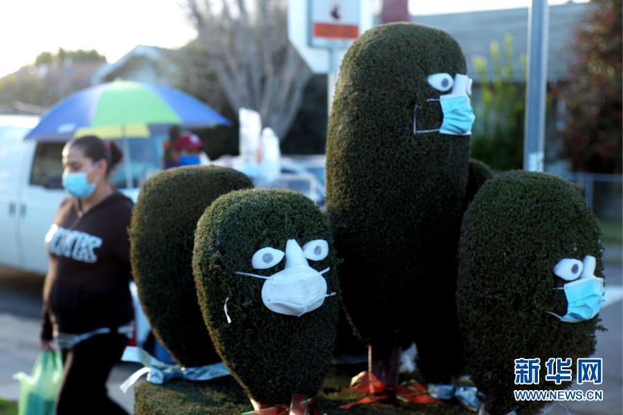2月17日,在美国加利福尼亚州北部小城圣马特奥,街道边的几株景观植物被装饰成戴着口罩的拟人形象,以提醒人们在外活动时佩戴口罩,减少新冠病毒的传播风险。新华社记者 吴晓凌 摄
