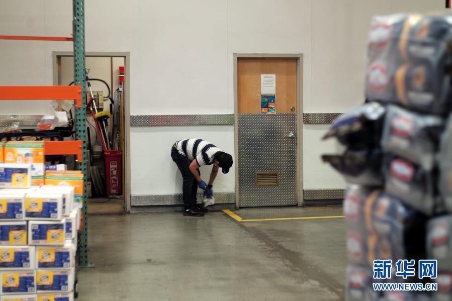 2月23日,工作人员在美国加利福尼亚州福斯特城的开市客超市清洁墙面。新华社记者 吴晓凌 摄