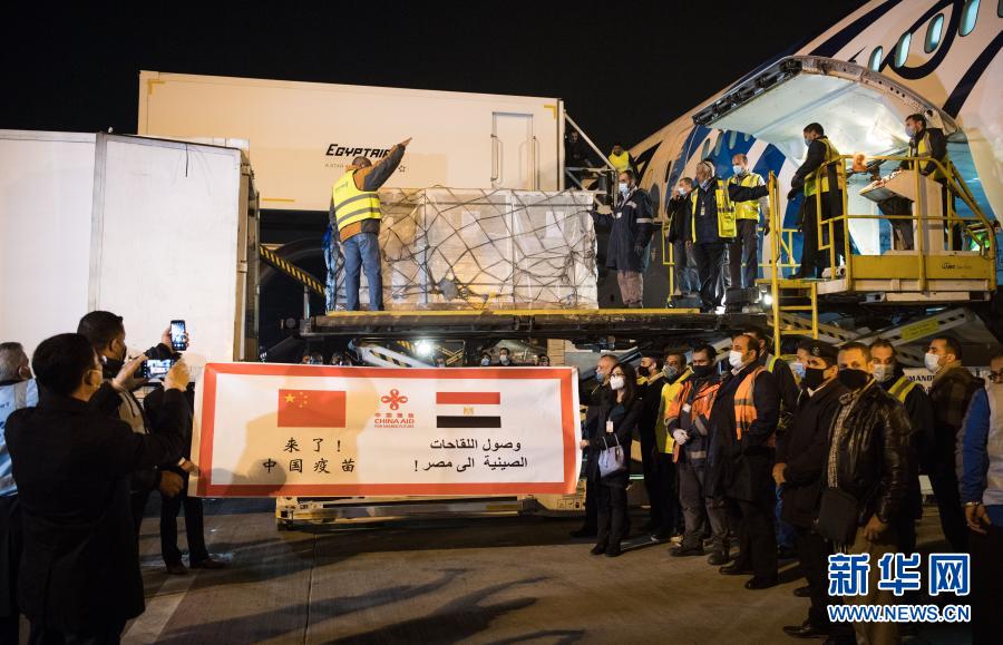 中国援助埃及的首批新冠疫苗23日凌晨运抵开罗,援助阿盟秘书处的新冠疫苗也同机抵达。新华社记者 邬惠我 摄