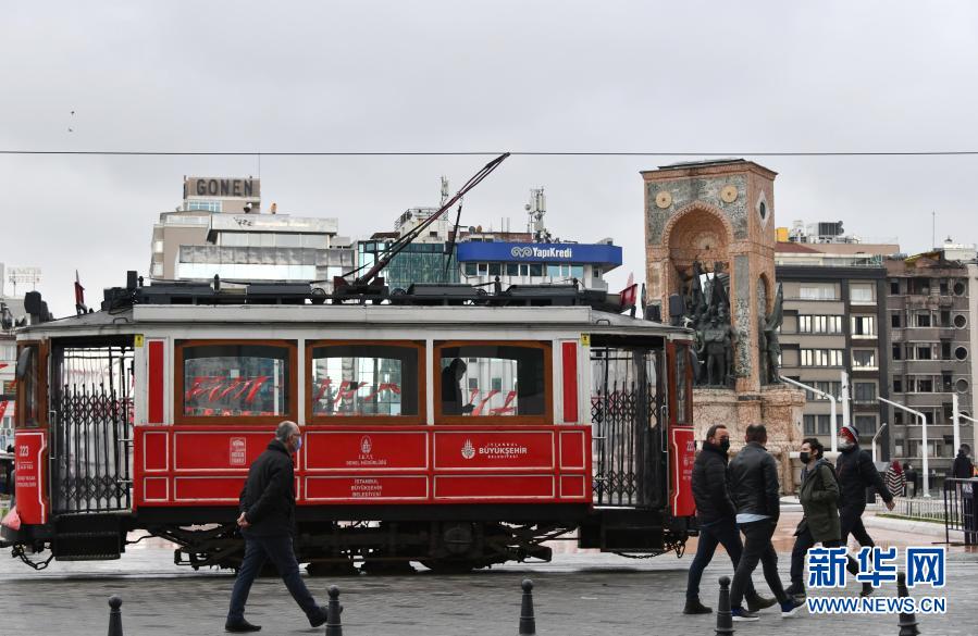 2月25日,在土耳其伊斯坦布尔的塔克西姆广场,行人从有轨电车前走过。 土耳其国家统计局日前公布的数据显示,受新冠疫情影响,土耳其2020年旅游收入约为120亿美元,较上年减少近三分之二。 新华社记者 徐速绘 摄