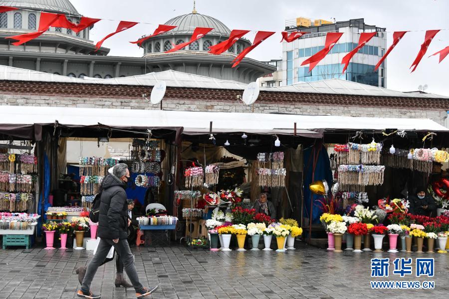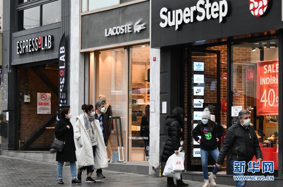 2月25日,行人走过土耳其伊斯坦布尔的商业步行街。 土耳其国家统计局日前公布的数据显示,受新冠疫情影响,土耳其2020年旅游收入约为120亿美元,较上年减少近三分之二。 新华社记者 徐速绘 摄