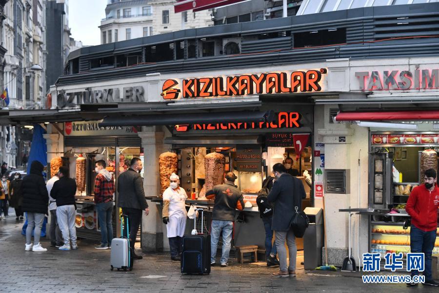2月25日,在土耳其伊斯坦布尔的塔克西姆广场,人们购买土耳其烤肉。 土耳其国家统计局日前公布的数据显示,受新冠疫情影响,土耳其2020年旅游收入约为120亿美元,较上年减少近三分之二。 新华社记者 徐速绘 摄