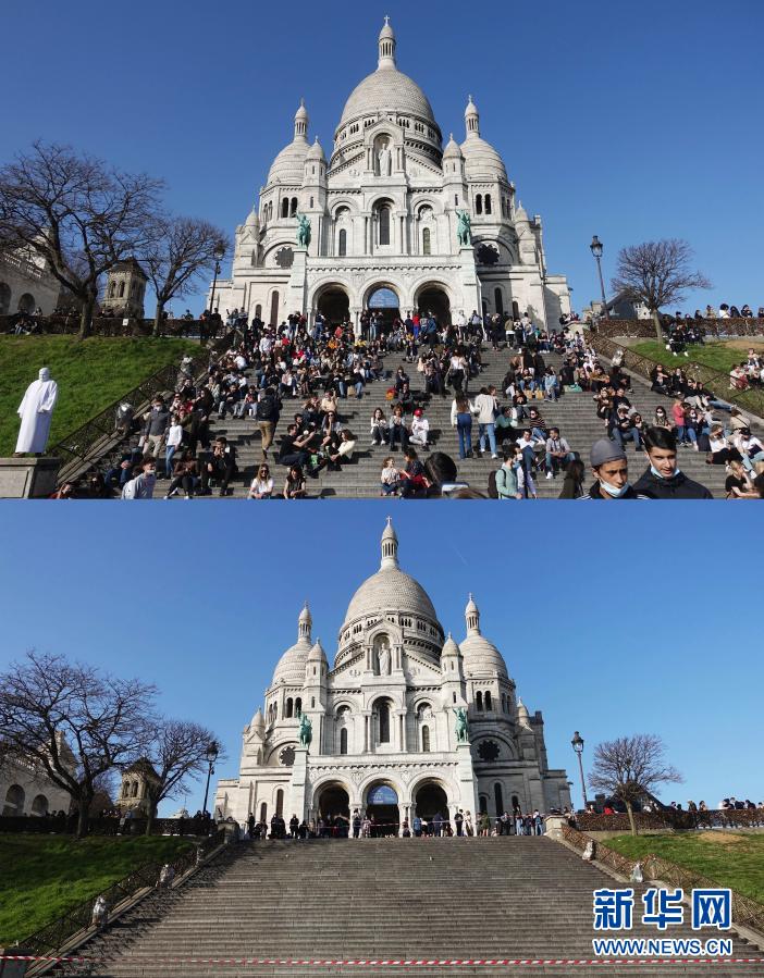 这张拼版照片显示的是,2月24日,警察劝散聚集在法国巴黎蒙马特高地圣心教堂前台阶上的人群前(上)后的对比图。