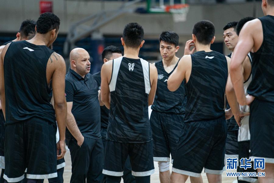 2月25日,北京首钢队主教练雅尼斯(左三)在训练中与球员交流。