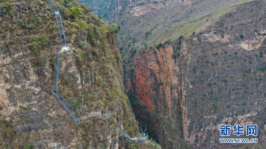 这是通往四川省凉山彝族自治州昭觉县支尔莫乡阿土列尔村峭壁上的钢梯(2019年11月23日摄,无人机照片)。新华社记者 江宏景 摄