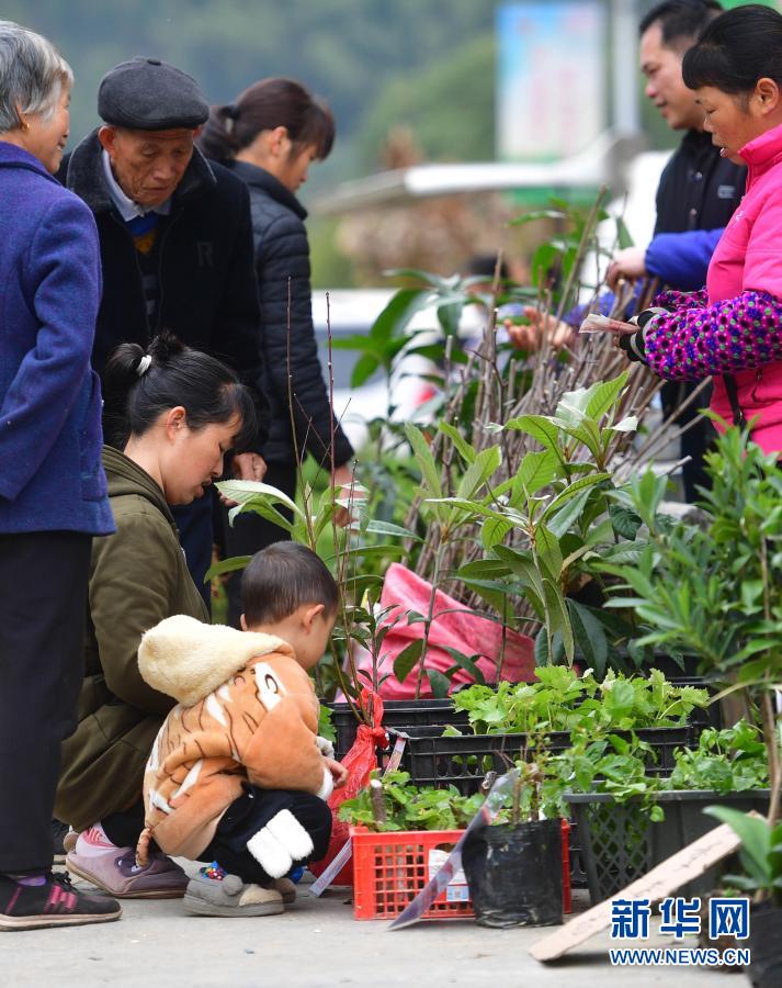 3月2日,在广西融安县大坡乡集市上,人们在购买树苗。