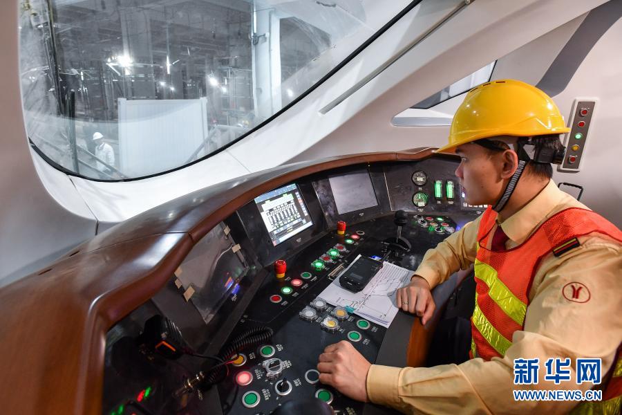 3月3日,参加热滑试验的地铁驾驶员在广州地铁18号线时速160公里电客车驾驶室做发车准备。 3月3日凌晨,广州地铁18号线时速160公里电客车在横番3号风井至番禺广场站段进行全线首次热滑试验,以对该线地铁供电、信号、通信、线路、机电等系统设备进行全面检测。 新华社记者刘大伟摄