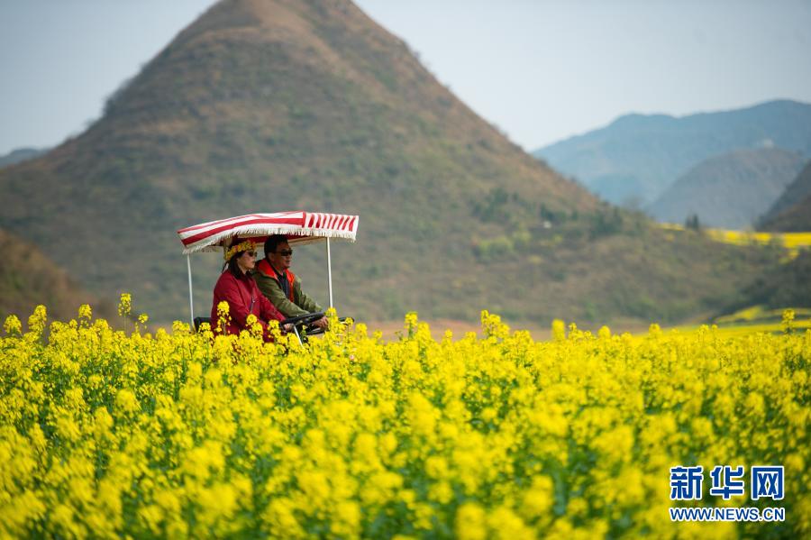 游客在罗平县金鸡峰丛景区观赏油菜花(3月2日摄)。新华社记者 王冠森 摄 |