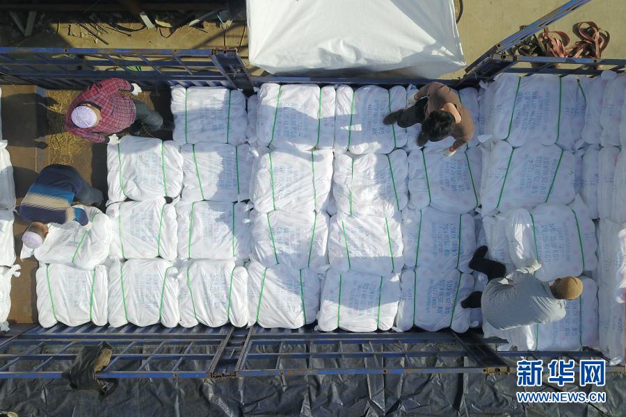 3月3日,在东乡族自治县方大丽明纺织有限公司扶贫车间,工人们将涤纶缝纫线产品装车(无人机照片)。