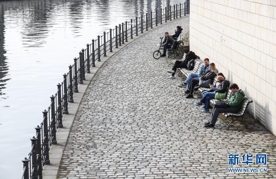 3月3日,人们坐在德国首都柏林施普雷河畔的长椅上。