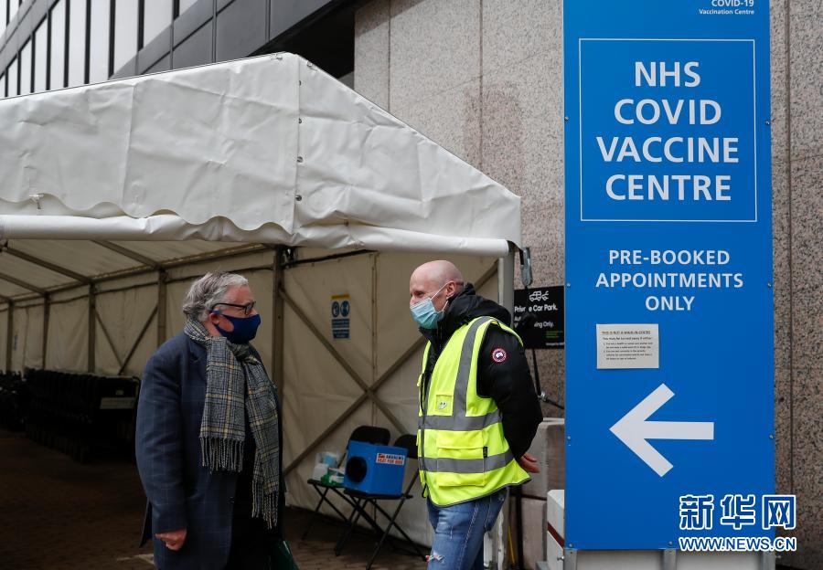 3月4日,一名男子(左)在英国伦敦的一个新冠疫苗接种中心与工作人员交流。
