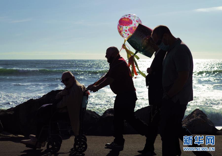 3月5日,亲朋在美国加利福尼亚州半月湾市为一名90岁老人庆生。 半月湾所在的圣马特奥县目前已从加州四级防疫层级中最高的“紫色”等级进入“红色”等级。餐馆可以恢复堂食。电影院、博物馆和健身房等室内活动在控制客流的前提下重新开放,并放宽了人员在室外活动的时间限制。新华社记者 吴晓凌 摄
