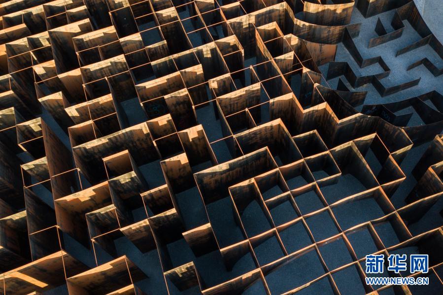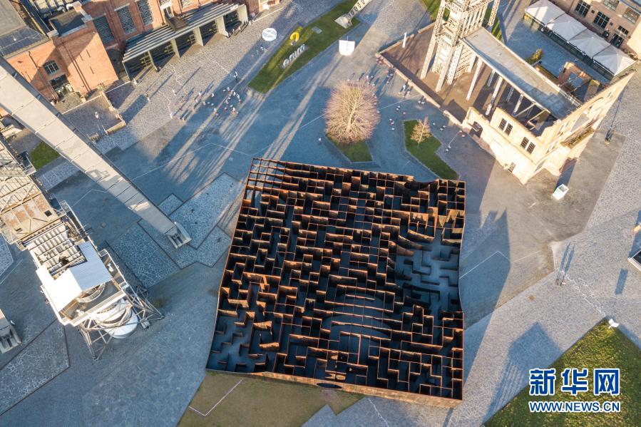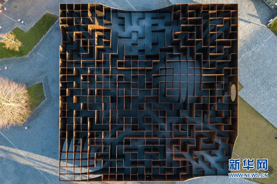 这是3月2日在比利时亨克市C-Mine艺术中心拍摄的装置作品“迷宫”(无人机照片)。 在比利时亨克市由旧矿区改建的C-Mine艺术中心广场上,有一件名为“迷宫”的装置艺术作品,“迷宫”由钢板搭建而成。作品构思巧妙,设计师利用几何结构创造出全新的空间体验,人们走在其中仿佛在看一场雕塑展,因此又被称之为“雕塑迷宫”。新华社记者 张铖 摄
