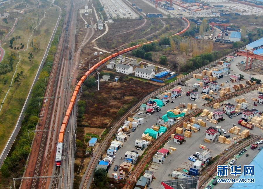 中欧班列(中国郑州至芬兰赫尔辛基)驶出中国铁路郑州局集团有限公司圃田车站(2020年11月20日摄,无人机照片)。新华社记者 郝源 摄