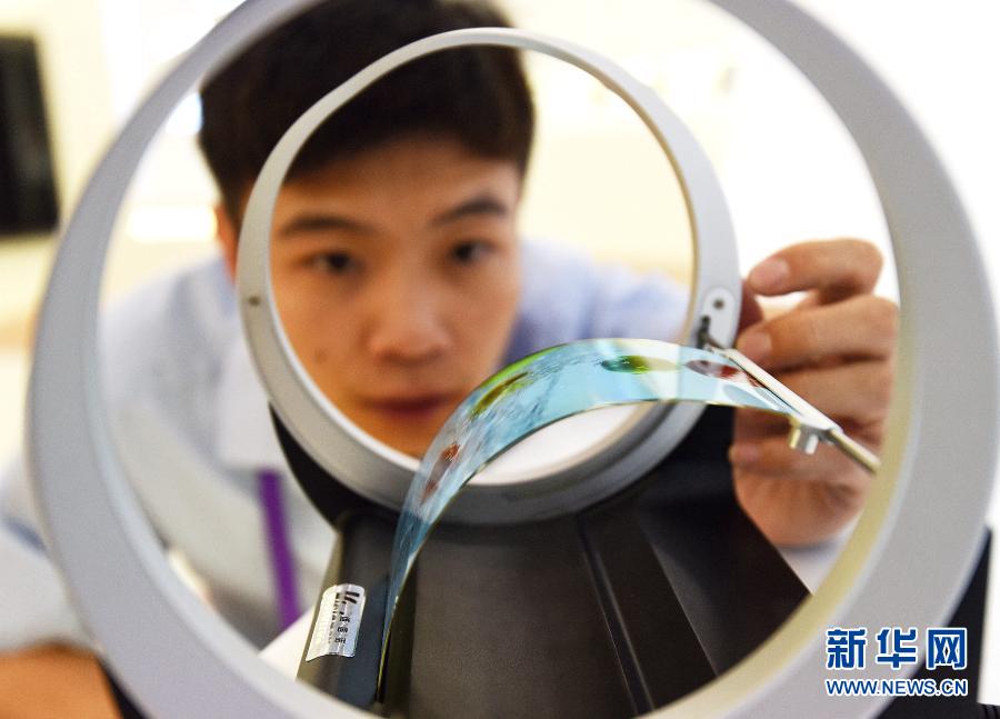在河北廊坊市霸州经济开发区高新技术产业园维信诺公司,技术人员对柔性测试样品进行检查(2018年7月13日摄)。廊坊市依托毗邻京津的区位优势和京津冀协同发展重大机遇,围绕新型显示、高端制造、新材料、新能源等领域,打造高新技术产业集群。新华社记者 王晓 摄