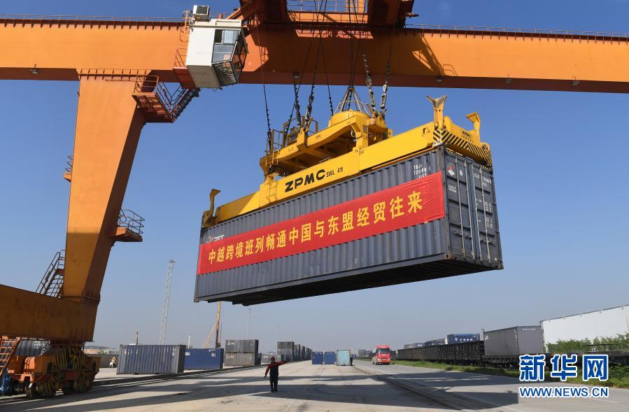 在广西南宁国际铁路港,工人在吊装集装箱(2020年11月11日摄)。新华社记者 陆波岸 摄