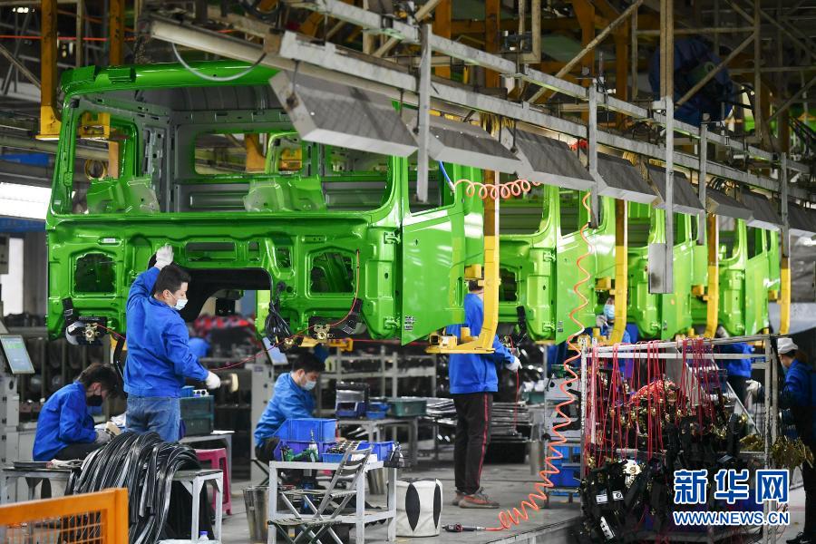 工人在位于西安的陕西汽车控股集团有限公司重卡总装线上作业(2月24日摄)。近年来,陕西汽车控股集团有限公司坚持以创新引领发展,积极构建跨学科、跨领域的产学研创新平台,加快清洁能源、智能网联、自动驾驶等技术研究,2020年全年销售汽车23.5万辆,实现工业总产值1039亿元。新华社记者 张博文 摄