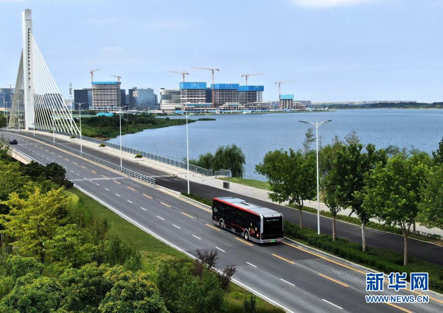 河南省郑州市郑东新区自动驾驶公交1号线车辆行驶在试运行的道路上(2020年8月18日摄,无人机照片)。新华社记者 李安 摄