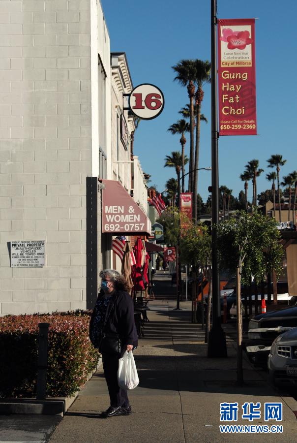3月6日,一名女子从美国加利福尼亚州米尔布雷的街头走过,街上挂着写有粤语“恭喜发财”发音的条幅。新华社记者 吴晓凌 摄 |