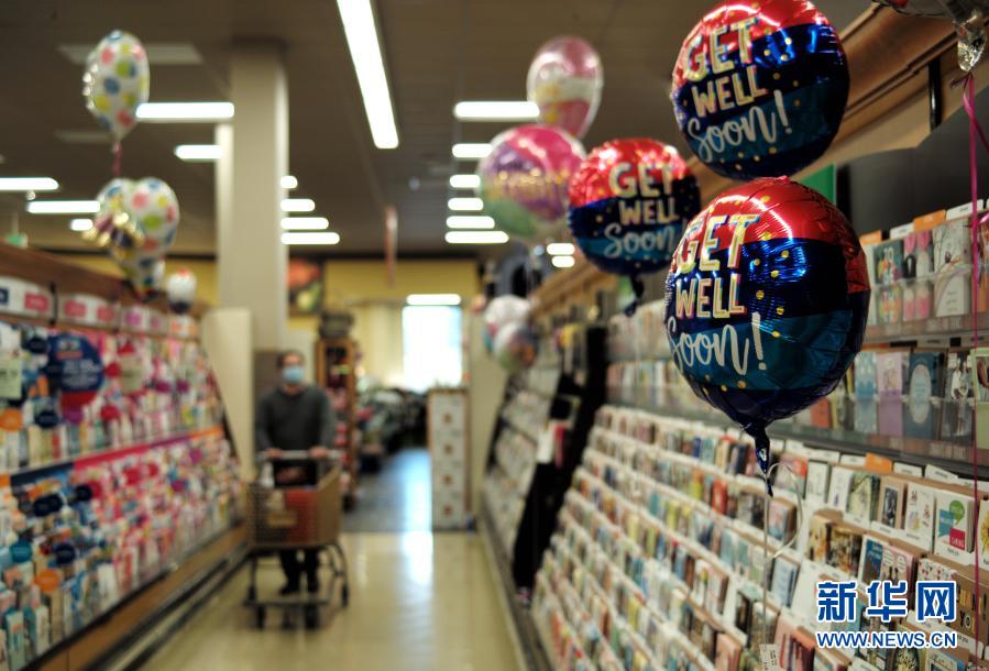 3月6日,在美国加利福尼亚州米尔布雷一家商店,印有“快好起来”字样的气球悬挂在礼品卡货架上。新华社记者 吴晓凌 摄