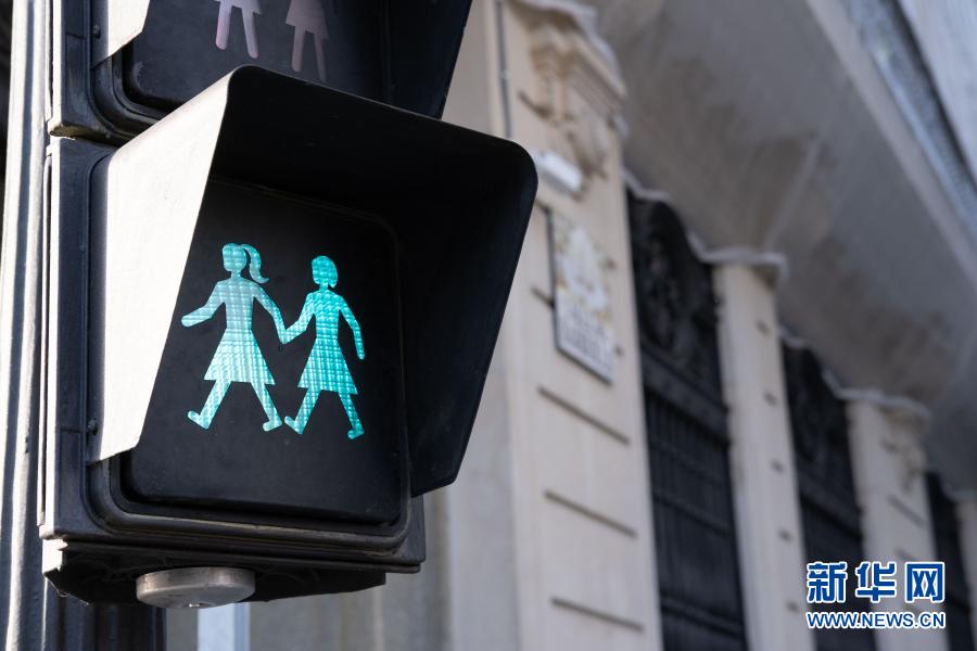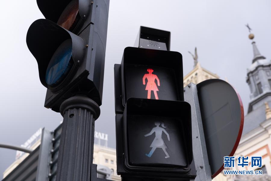 这是3月6日在西班牙马德里街头拍摄的行人信号灯。 西班牙马德里2017年耗资22000欧元,在72处路口更换了288个行人信号灯。其中有穿裙装、手牵手等不同的形象,用以号召性别平等。 新华社记者 孟鼎博 摄