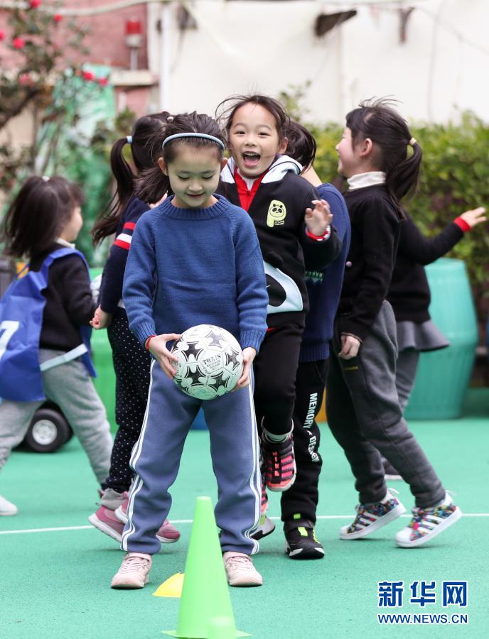 3月9日,上海市徐汇区科技幼儿园的小朋友在进行足球趣味练习。