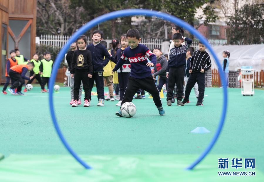3月9日,上海市徐汇区科技幼儿园的小朋友在进行足球趣味练习。