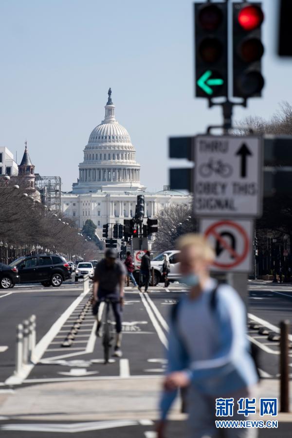 3月10日,在美国首都华盛顿,人们经过国会大厦附近的一处路口。新华社记者刘杰摄