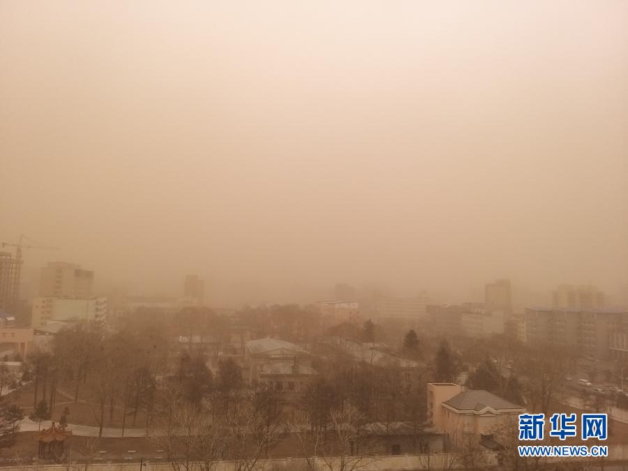 这是3月14日拍摄的沙尘暴中的蒙古国乌兰巴托。