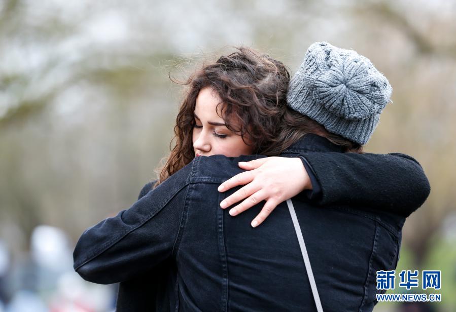 3月15日,人们在英国伦敦西南部的克拉珀姆公共绿地的鲜花旁拥抱,悼念遇害女子萨拉·埃弗拉德。新华社记者 韩岩 摄