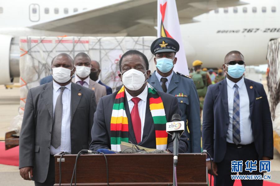 3月16日,津巴布韦总统姆南加古瓦在津巴布韦首都哈拉雷的罗伯特·穆加贝机场致辞。 由中国政府援助的第二批新冠疫苗16日由津巴布韦航空公司专机运抵首都哈拉雷的罗伯特·穆加贝机场,津政府从中国购买的首批疫苗也同机抵达。 新华社记者 张玉亮 摄