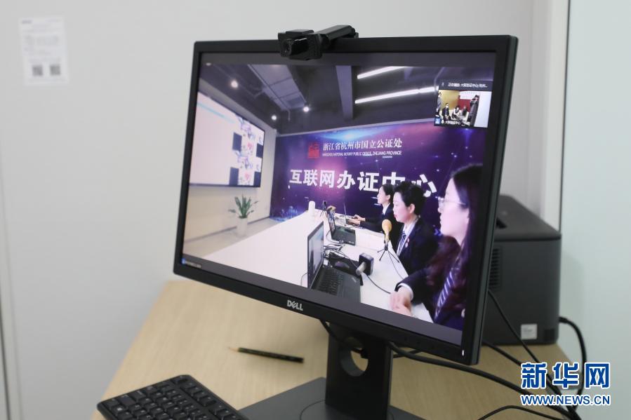这是3月17日在日本大阪拍摄的中国驻大阪总领馆与浙江省杭州市国立公证处视频连线现场。 中国驻大阪总领馆17日与浙江省杭州市国立公证处连线,合作为一名旅日中国公民办理了远程视频委托公证书。这是首次中国驻外使领馆与国内公证机构合作完成跨国远程视频公证。 新华社记者 杜潇逸 摄
