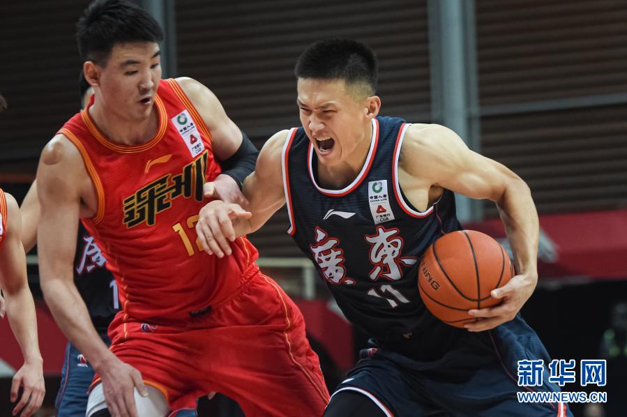 3月17日,广东东莞大益队球员周鹏(右)在比赛中突破深圳马可波罗队球员顾全的防守。